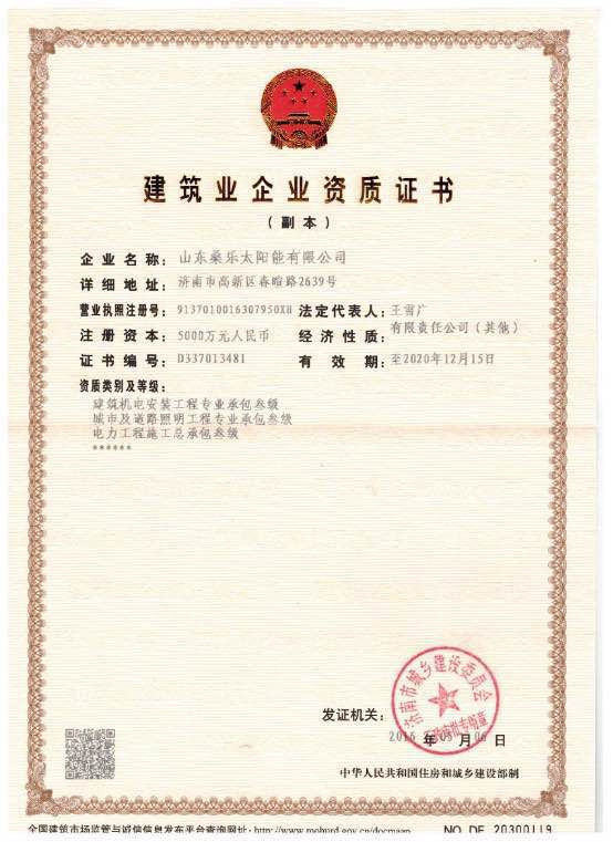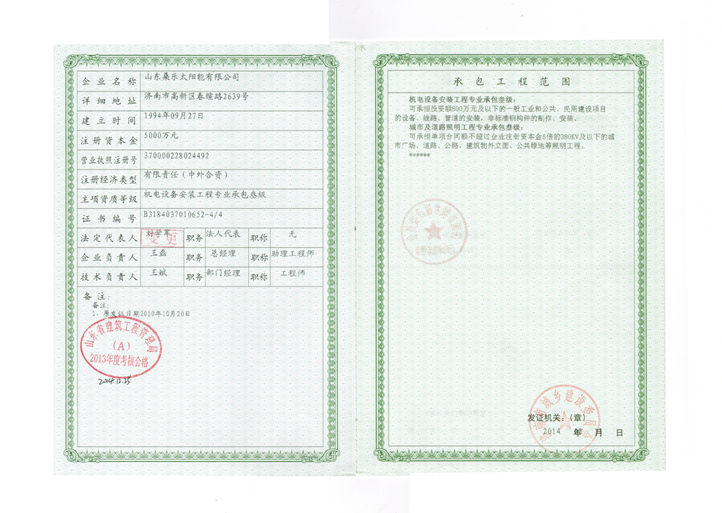 太陽能熱利用工程設(shè)計(jì)、施工資質(zhì)A級(jí)證書