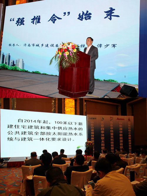 大會由桑樂集團第一工程公司經(jīng)理王海燕主持。會議從濟南市城鄉(xiāng)建設(shè)委“強推令”始末講起,自2014年1月1日起,濟南市決定100米以下新建高層住宅和集中使用熱水的公共建筑強制推廣使用太陽能熱水系統(tǒng),同時推出實施細則和相應(yīng)的圖則。2014年4月1日《杭州市民用建筑節(jié)能條例》也規(guī)定:十二層以下新建居住建筑,超過十二層新建居住建筑的逆六層,應(yīng)當(dāng)設(shè)計太陽能熱水系統(tǒng)與建筑一體化。太陽能強推政策,節(jié)能減排,勢在必行。