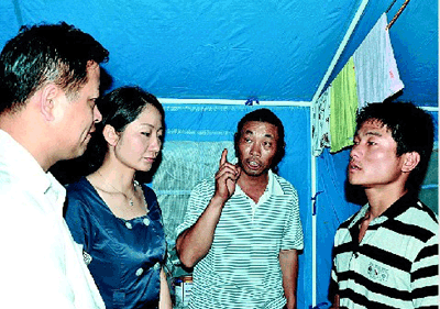 桑樂公司將滿滿的幾車救災(zāi)物資交到災(zāi)民安置點后,隨相關(guān)負(fù)責(zé)人一同進(jìn)入集中安置點進(jìn)行慰問。耿剛等人看到一座座藍(lán)色的災(zāi)民帳篷,災(zāi)民圍坐帳篷邊,心情十分沉重。當(dāng)他們走到