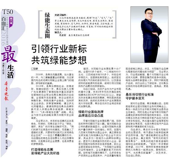 2016年,是桑樂擁抱社會、改革進(jìn)取、銳意創(chuàng)新的一年,桑樂當(dāng)家人王雪廣先生邀請到了管理經(jīng)驗(yàn)豐富且深諳市場營銷的馬全軍出任桑樂集團(tuán)執(zhí)行總經(jīng)理,全面提升系統(tǒng)管理,樹立全新網(wǎng)點(diǎn)銷售形象;積極完善產(chǎn)業(yè)鏈條,加快研發(fā)企業(yè)新品;改革營銷策略,建立多元化傳播理念;邀請倪萍擔(dān)任桑樂品牌形象代言人并提出桑樂新能源,綠能發(fā)展——“LE+綠能生態(tài)圈”戰(zhàn)略,將企業(yè)乃至行業(yè)的戰(zhàn)略發(fā)展方向提升至全新高度。