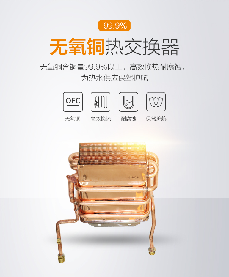 桑樂燃?xì)鉄崴鞑捎脽o氧銅(含銅量99.9%),是行業(yè)內(nèi)公認(rèn)的最好材質(zhì)。銅材純度高,高效換熱,耐高溫、耐腐蝕、抗氧化。采用三環(huán)纏繞設(shè)計(jì),極大的增大了導(dǎo)熱面積,提高加熱效率,升溫更快更節(jié)能,為熱水供應(yīng)保駕護(hù)航。