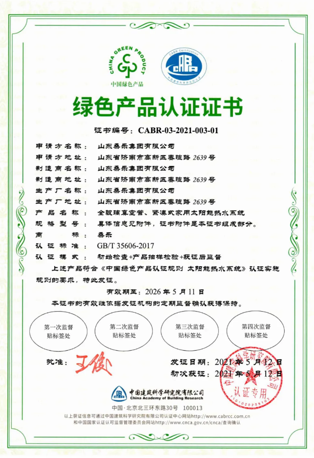 5月12日,通過(guò)中國(guó)建筑科學(xué)研究院有限公司認(rèn)證,桑樂(lè)集團(tuán)榮獲太陽(yáng)能熱水系統(tǒng)中國(guó)綠色產(chǎn)品認(rèn)證證書(shū),這也是中國(guó)建研院頒發(fā)的首個(gè)太陽(yáng)能領(lǐng)域綠色產(chǎn)品認(rèn)證證書(shū)。